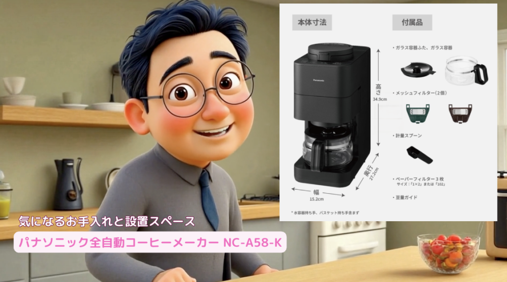 皆さん、こんにちは。今回は、自宅で本格コーヒーを楽しみたい方必見のアイテムをご紹介します。パナソニックの全自動コーヒーメーカー、NC-A58-Kです。