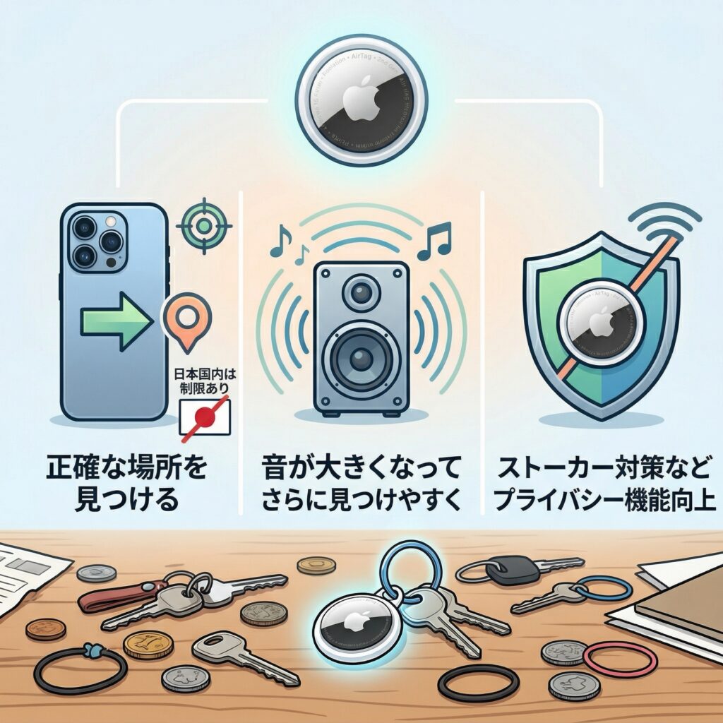 【※ご購入前の注意事項】 本記事に記載しているAirTag(第2世代)の仕様や、日本国内での機能制限などに関する情報は、執筆時点の最新情報をもとに誤りがないよう最善を尽くして作成しております。ただし、今後のiOSアップデートや法規制の変更等により仕様が変わる可能性がございます。ご購入の際は、必ず一度ご自身でApple公式サイトの製品ページ等にて最新の仕様や対応状況をご確認ください。
